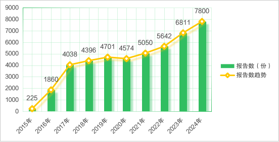 在国家化妆品不良反应监测系统中,2024年重庆市共收到《化妆品不良反应/事件报告表》7800份,同比增加14.52%,其中严重报告7份,每百万人口平均报告数为244份,同比增加15.09%。2015至2024年,重庆市累计收到《化妆品不良反应/事件报告表》45097份,详见图1。