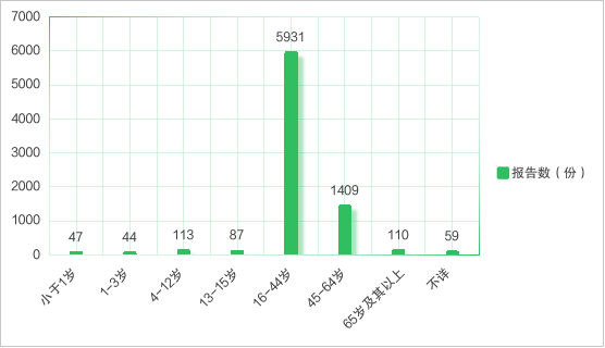 患者/消费者年龄主要集中在16-44岁,共有5931例,占76.04%;年龄12岁以下的报告共有204例,占2.61%;年龄65岁及以上的报告共有110例,占1.41%,详见图4。但染发类产品涉及患者/消费者年龄主要集中在45-64岁,占比51.70%,远高于总体报告中该年龄段占比(18.06%),16-44岁年龄段仅占36.36%。